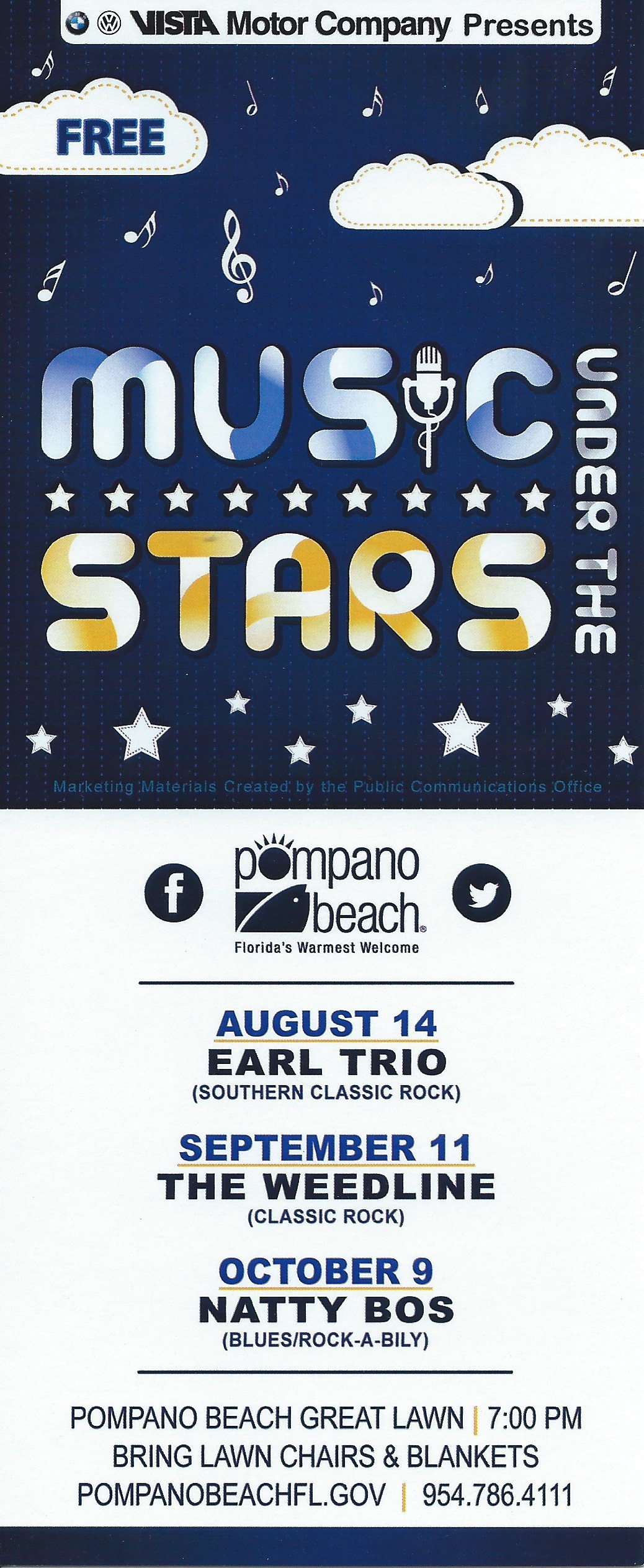 Malaney is a talented lead vocalist and lead guitarist. He headlines the classic rock band, “The Earl Trio”. Malaney also performs professional as a soloist and is diversely trained both in opera/classical as well as popular singing. “Music Under The Stars” is presented by “Vista Motor Company” and is a free concert this Friday evening at 7:00 on the Pompano Beach Great Lawn. Get there early, the event is known to attract approximately six hundred people. A concert event promo is included in this article below and to the right for further details.